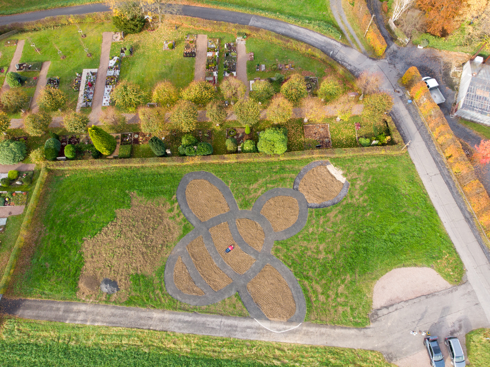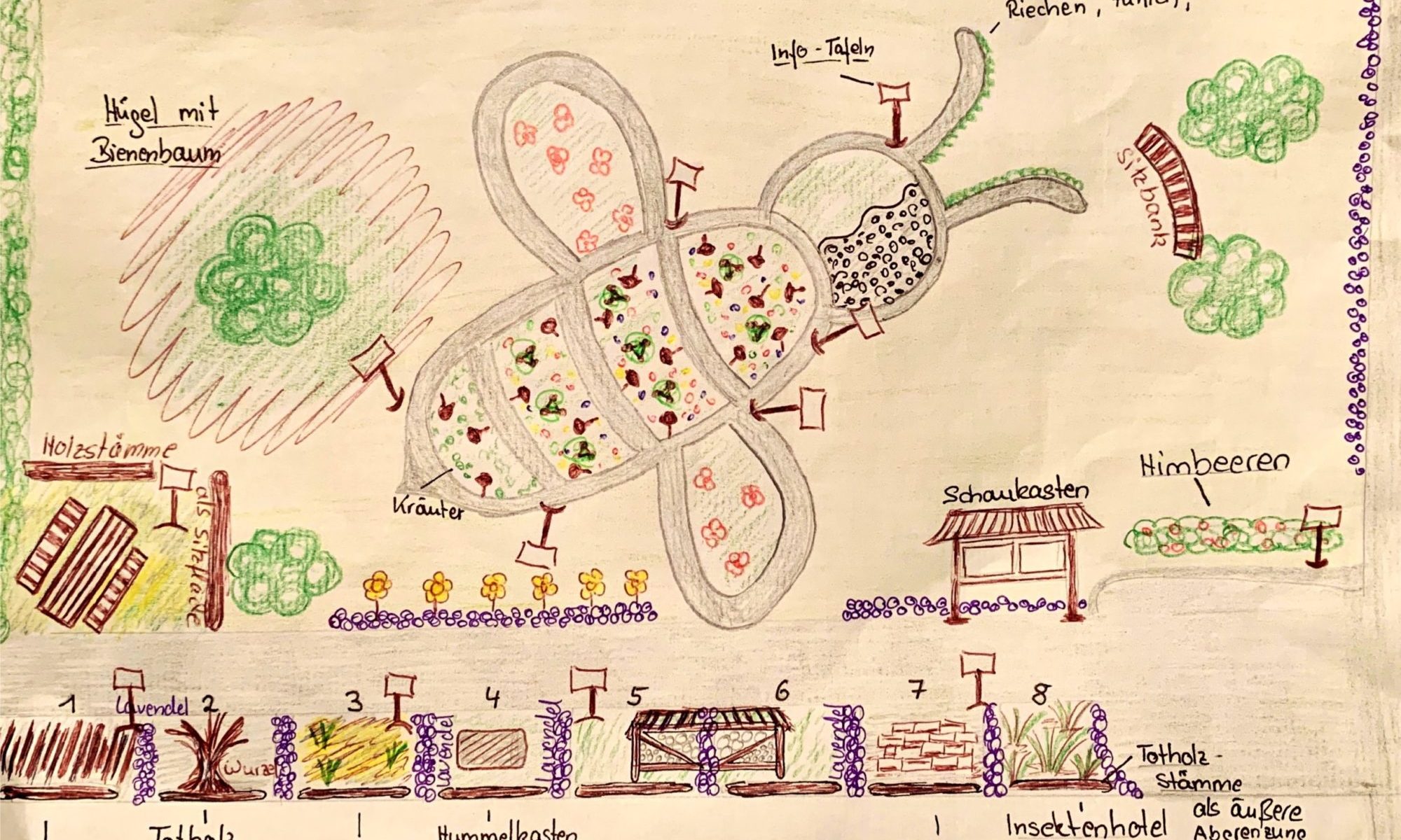 2020 entstand die Idee, eine ca. 1800 qm städtische Grünfläche in ein nektarreiches Bienenparadies zu verwandeln und unseren wichtigsten Bestäubern, den Wildbienen, einen Ausgleich zu den immer kleiner werdenden Bauerngärten zu bieten. Die Idee war, in Form einer überdimensionalen Biene unterschiedliche Beete anzulegen und mit bienenfreundlichen Pflanzen, seltenen Kräutern und Obstgehölzen zu bepflanzen, um den Wildbienen ein sattes Nahrungsangebot zu bieten und den Menschen Freude zu bereiten.