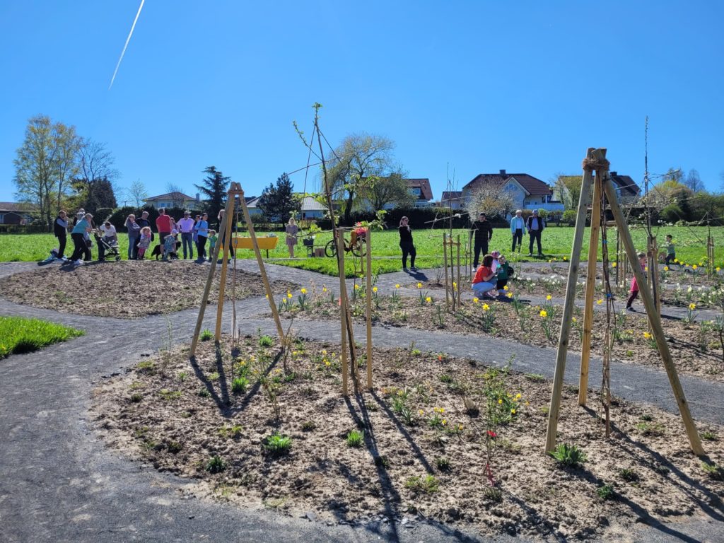 Die vielen helfenden Hände setzten unzählige bienenfreundliche Blumen und Kräuter in die Beete. Spalierobst und unterschiedliche Obstgehölze wurden in den Beeten verteilt eingepflanzt. Dazwischen wurden ca. 400 Blumenzwiebeln gesetzt, um auch den Frühling mit leuchtend gelben Narzissen einzuleuten.